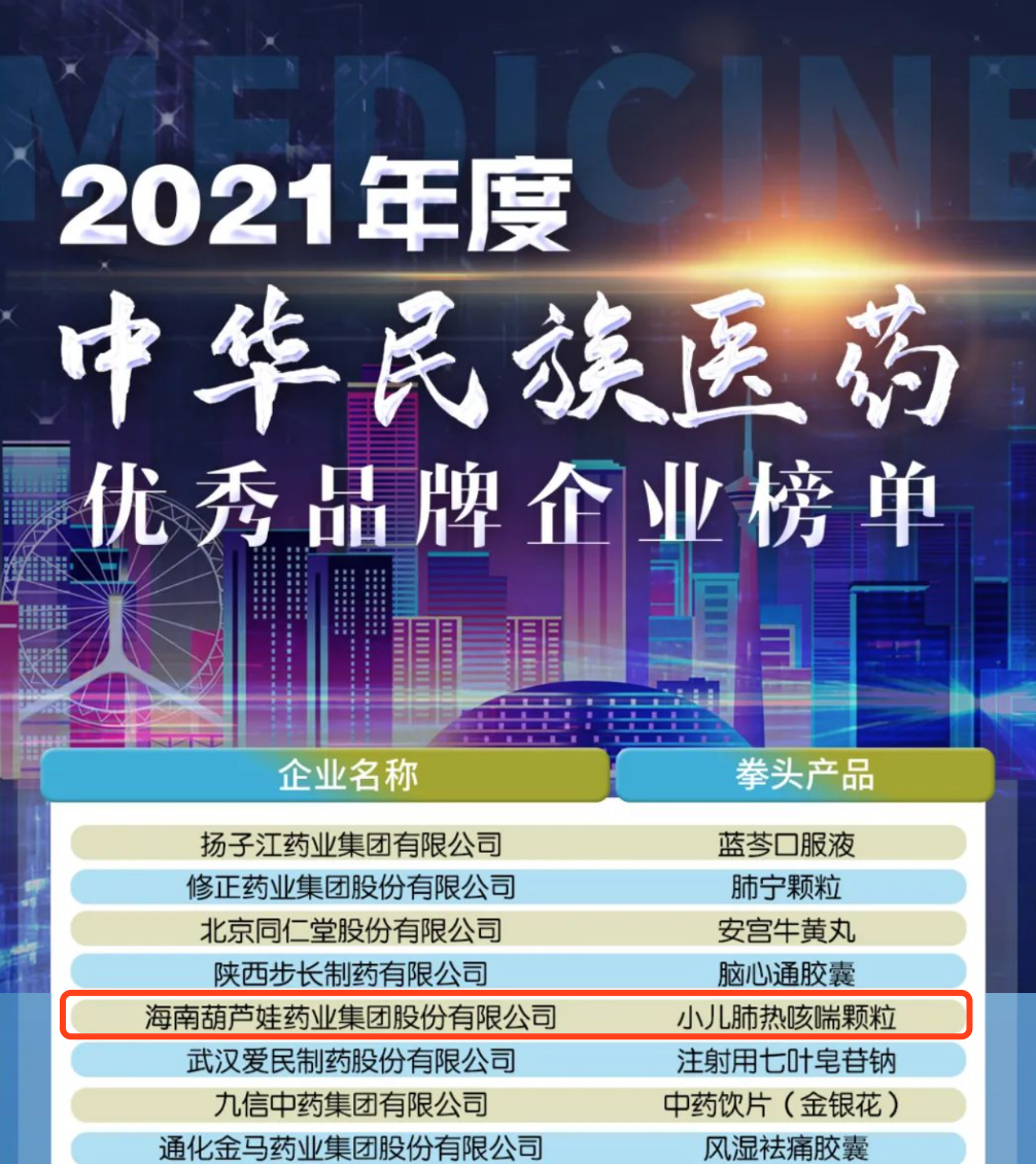 12月29日,全国工商联医药业商会发布了“2021年度中华民族医药优秀品牌企业榜单”,6008集团药业集团凭借黄金单品小儿肺热咳喘颗粒(4克)实力登榜。